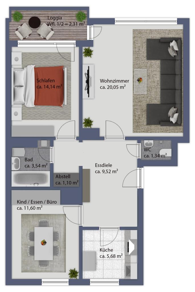 Das Wohnzimmer bietet nicht nur reichlich Platz für eine gemütliche Wohnatmosphäre, sondern auch direkten Zugang zur halb überdachten Loggia, die nach Nordwesten ausgerichtet ist. Auch vom größeren Schlafzimmer aus gelangen Sie direkt auf die Loggia, was den Wohnkomfort zusätzlich hervorhebt.