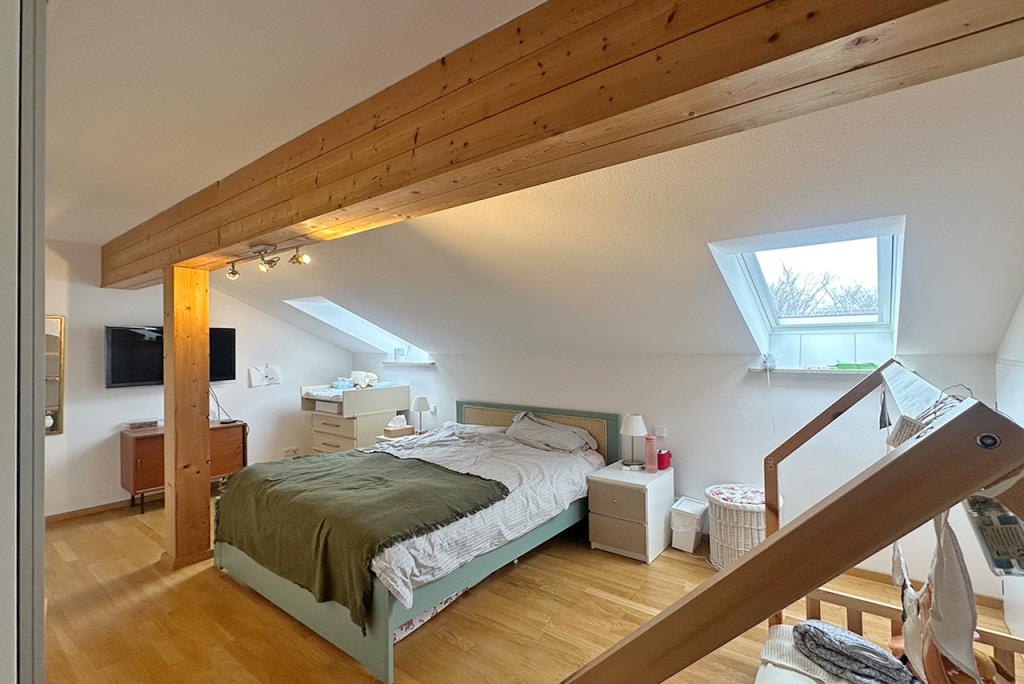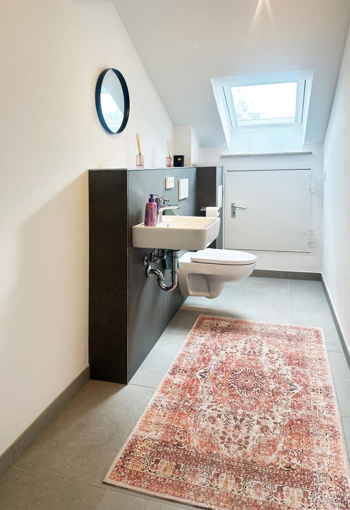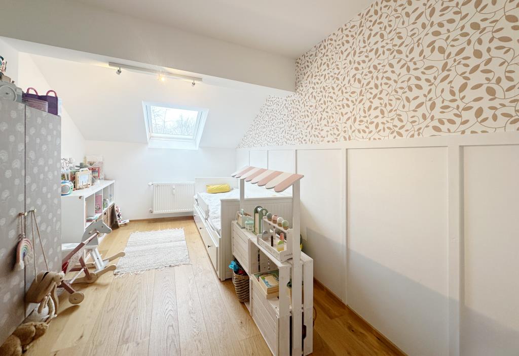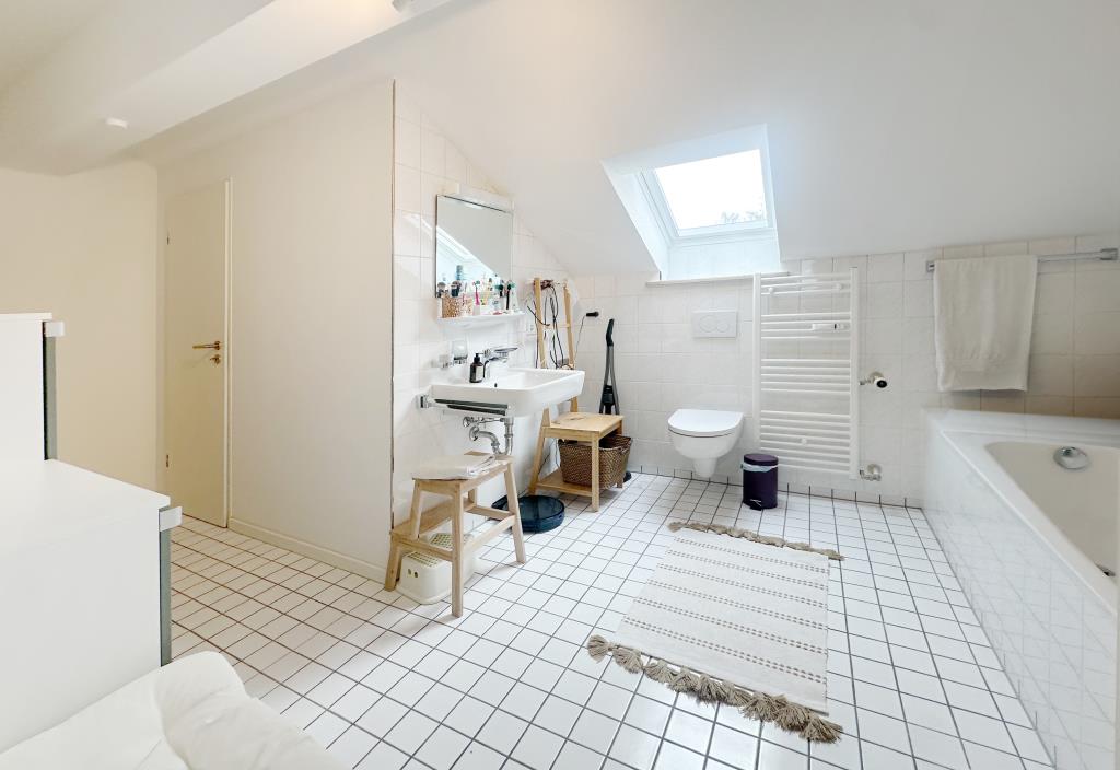 Alle Wohnbereiche sind mit einem hochwertigen Eichendielen-Parkett belegt. Die Küche, der Eingangsbereich, das Gäste-WC und das Badezimmer (Dusche und Badewanne) sind mit Fliesen ausgestattet. Die zahlreichen Dachflächenfenster bringen eine angenehme, helle Atmosphäre.