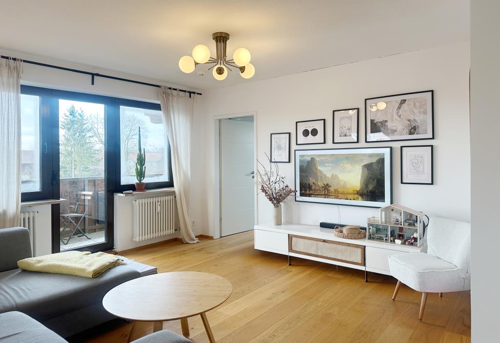 Die Wohnfläche von ca. 115 m² überzeugt durch eine klare und durchdachte Grundrissgestaltung. Mittelpunkt ist der rund 50 m² große Wohn-Ess-Kochbereich mit direkter Verbindung zur hochwertig ausgestatteten Küche und Küchentheke. Vom Wohnzimmer aus gelangen Sie auf den überdachten Süd-West-Balkon.