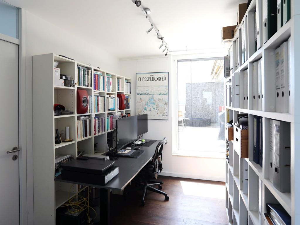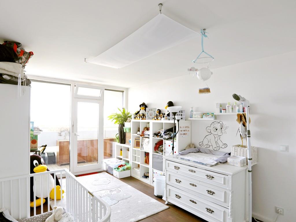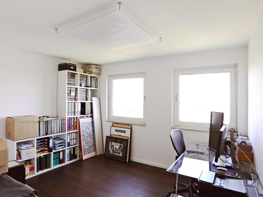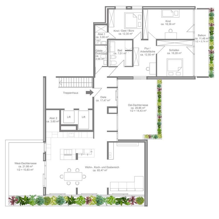 Die Wohnung ist durch eine Glastüre optimal in einen privaten Schlaf- und Arbeitsbereich und einen Wohnbereich aufgeteilt. Vom großzügigen Eingangsbereich mit Garderobe, Gäste-Duschbad und Zugang zur östlichen Dachterrasse aus nach links gehend gelangen Sie in den Privatbereich mit Flur, großem Badezimmer mit Badewanne und Dusche sowie geräumiger Arbeitsdiele und den drei Schlaf-/Kinder-/Gästezimmern (mit Wasch-/Abstellraum). An das Schlaf- und Kinderzimmer schließt sich der überdachte Ost-Balkon an. Vom Eingang aus nach rechts erreichen Sie den offenen, insgesamt ca. 65m² großen Wohn-Koch-Essbereich mit kompletter Fensterfront Richtung Süden sowie die westliche Dachterrasse.