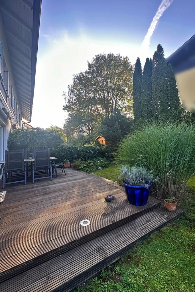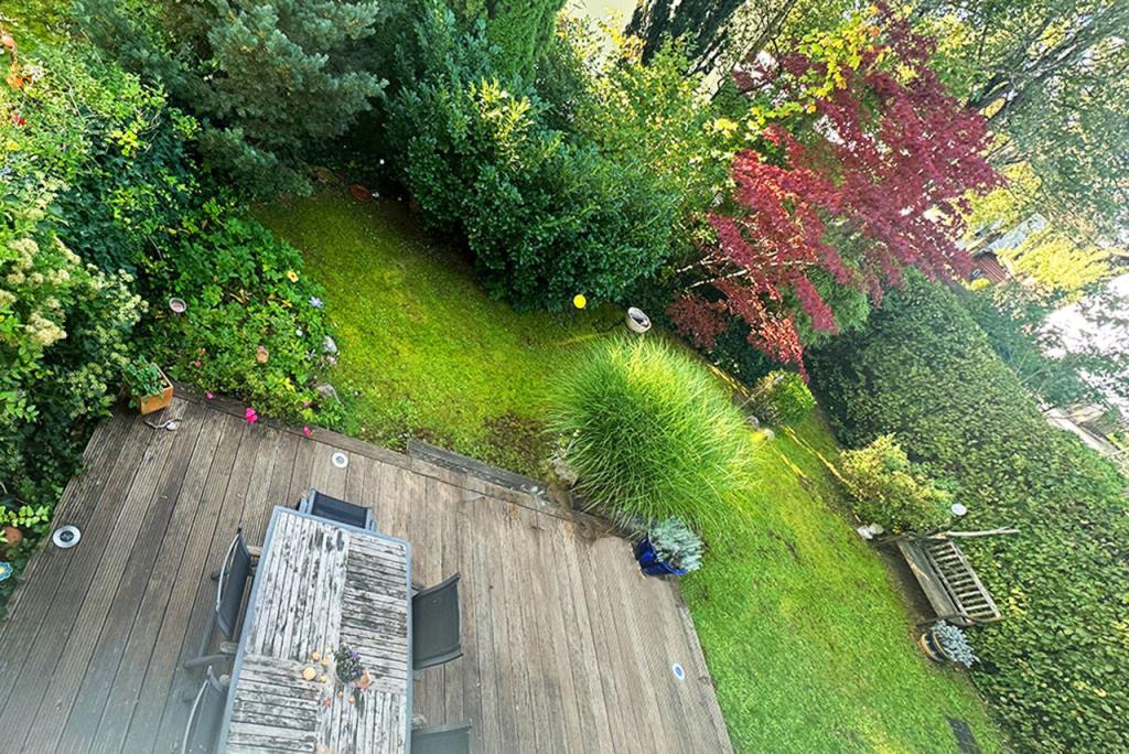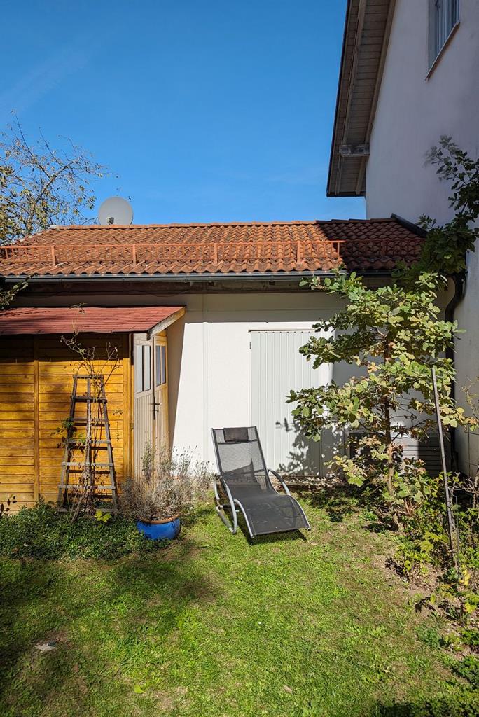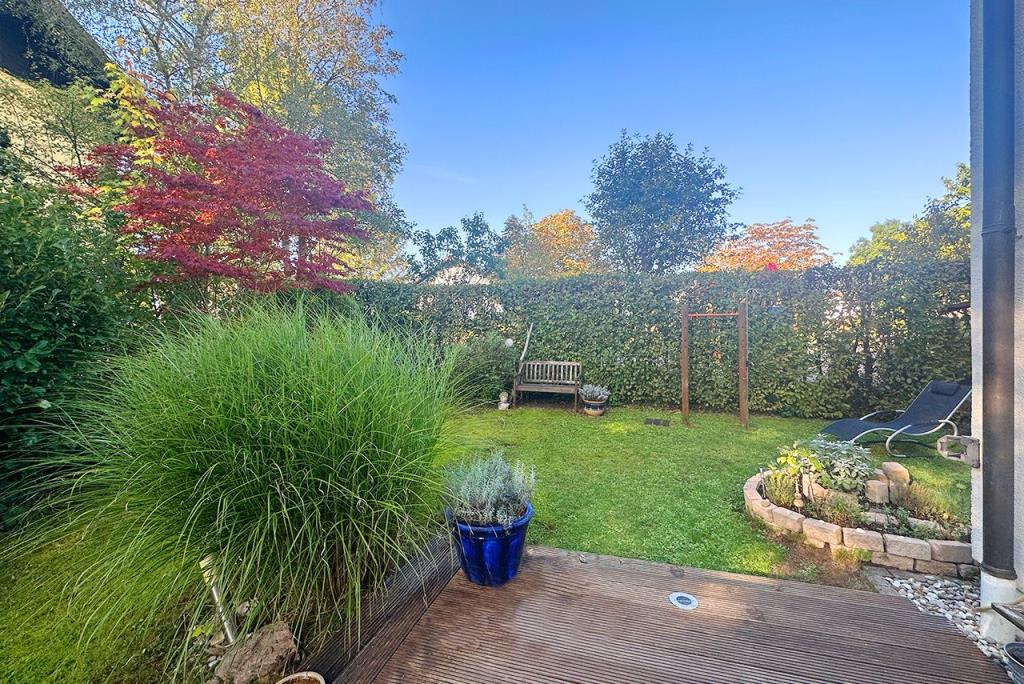 Ein Highlight ist der idyllisch eingewachsene Garten mit großer Süd-Terrasse aus Edelholz, Markise, Gartenhäuschen und Pflanzenfläche. Der Garten ist über drei Wege zugänglich – regulär über das Haus, über die Garage oder aber über einen kleinen Pfad vom hinteren Teil des Grundstückes aus.