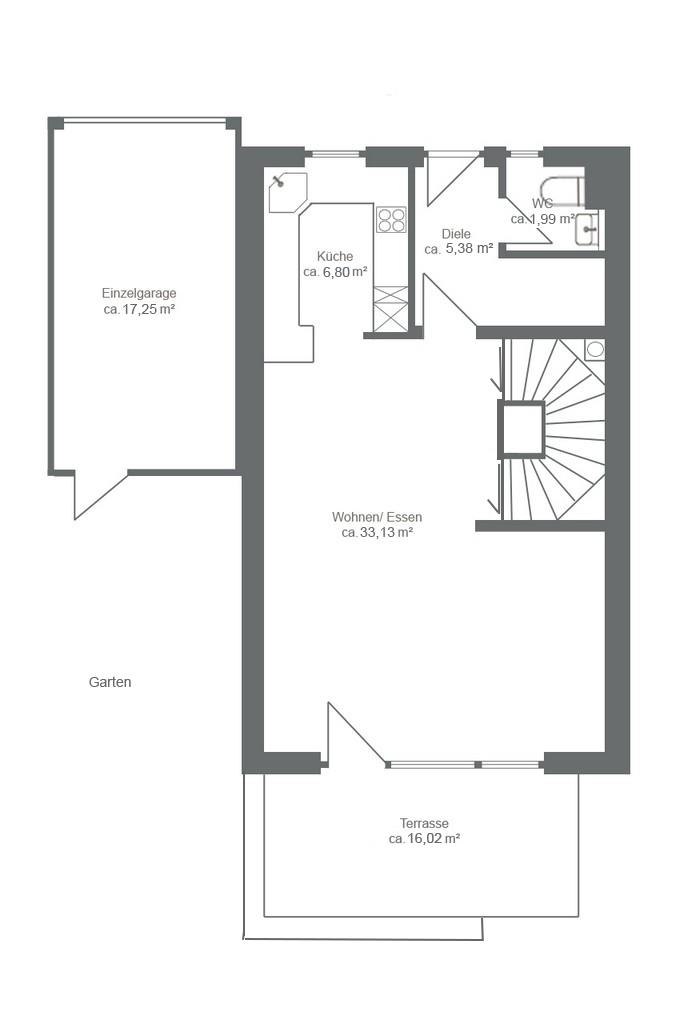 - EG: offener Wohn-Essbereich, vollausgestattete Küche, Diele und Gäste-WC