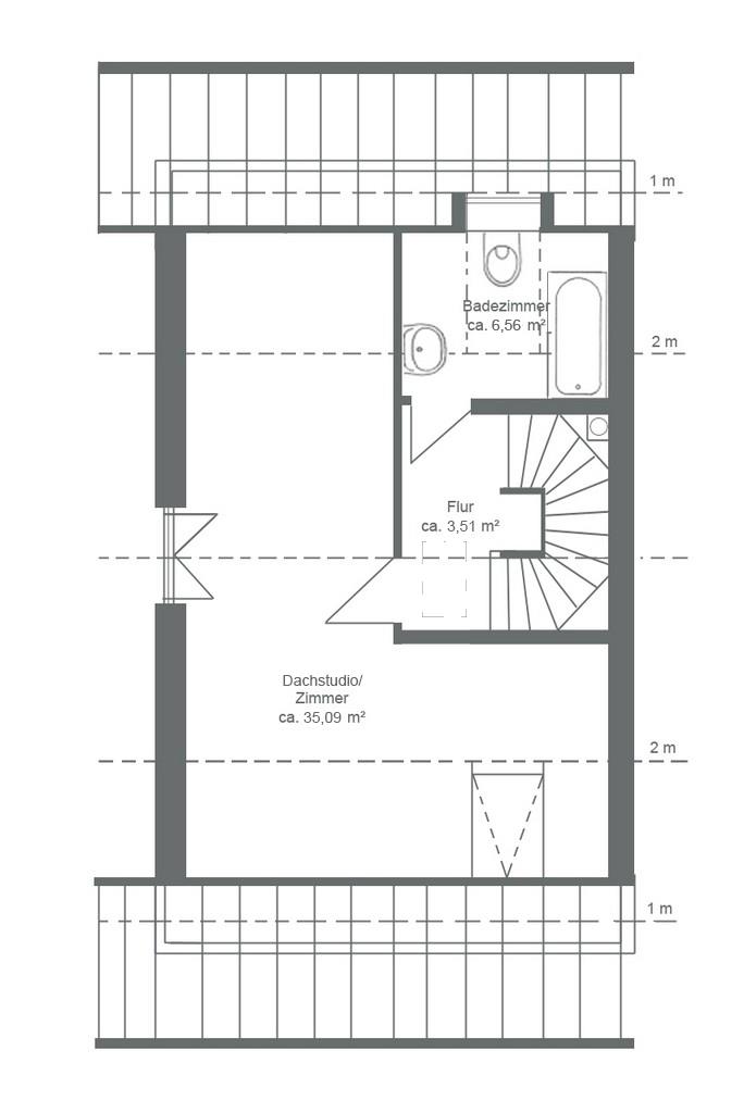 - DG: Dachstudio, Tagelichtbadezimmer mit Badewanne, Stauraum im Dachstuhl