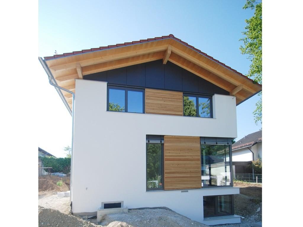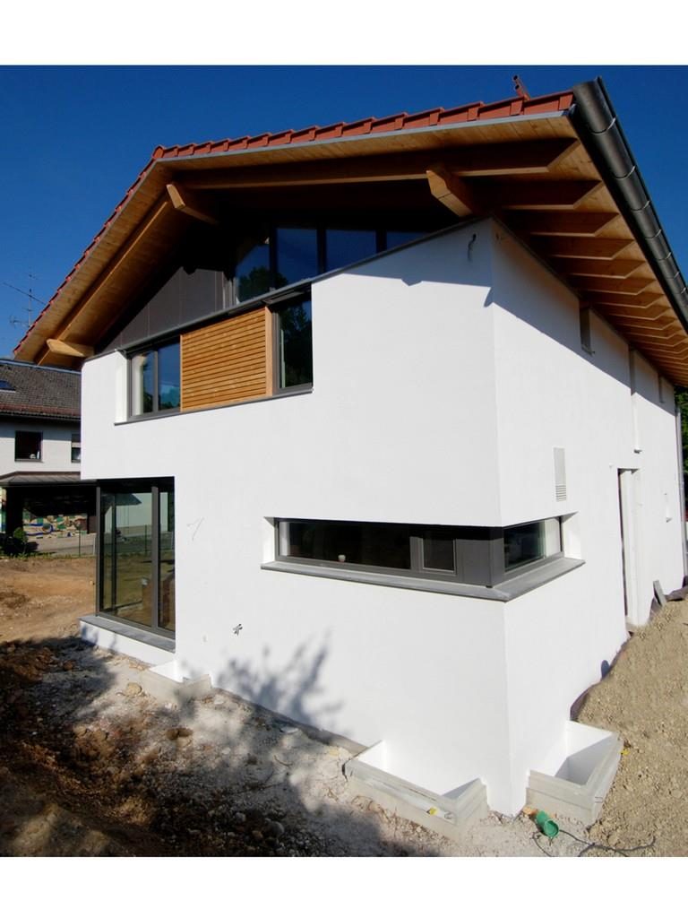 Material Dach: Zimmermannsmäßiger Holzdachstuhl, Isofloc, Holzfaserdämmplatten Pavatex, Ziegeldeckung Naturrot