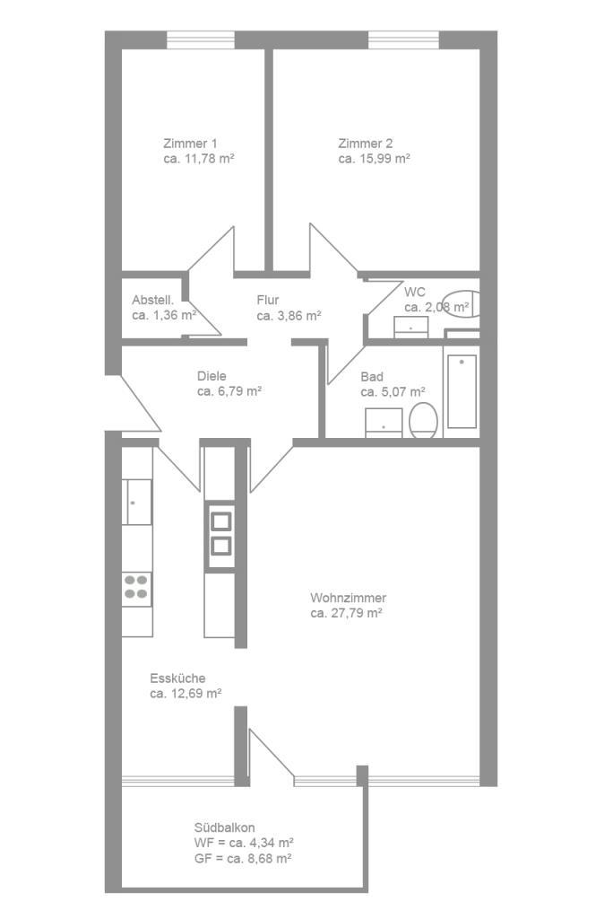 Das Herzstück der Wohnung bildet das große Wohnzimmer, das in direkter Verbindung zur hellen Essküche steht. Diese offene Gestaltung sorgt für eine angenehme Wohnatmosphäre und ermöglicht eine optimale Nutzung des Raumangebots. Der großzügige Süd-Balkon ergänzt das Raumangebot ideal und lädt dazu ein, entspannte Stunden im Freien zu genießen.