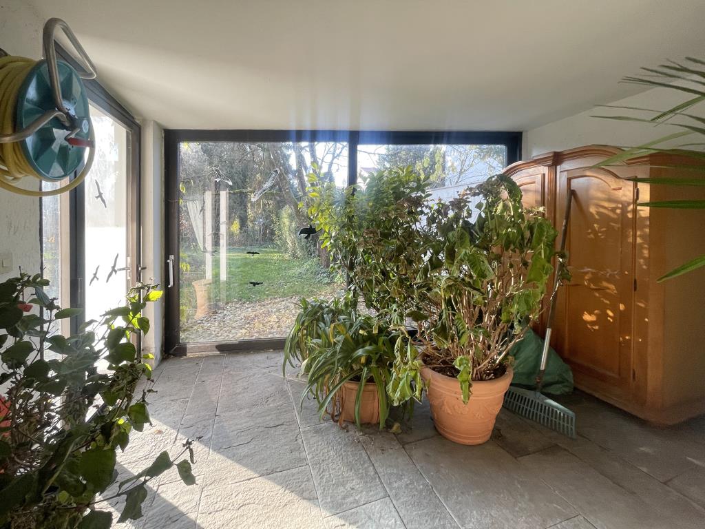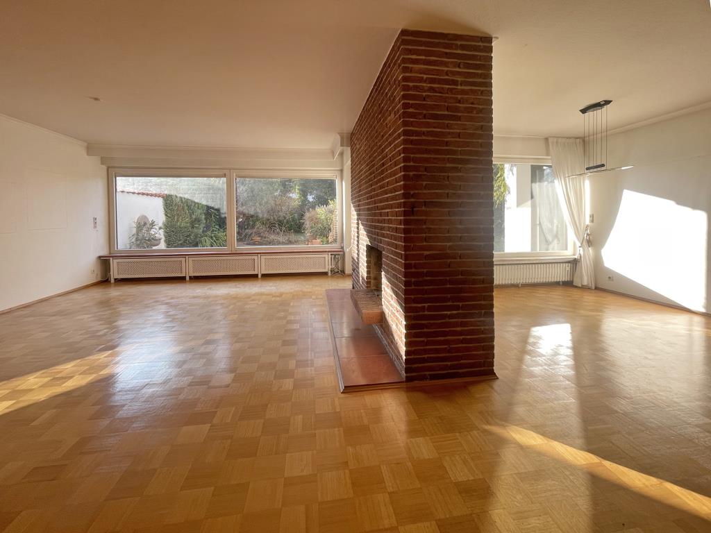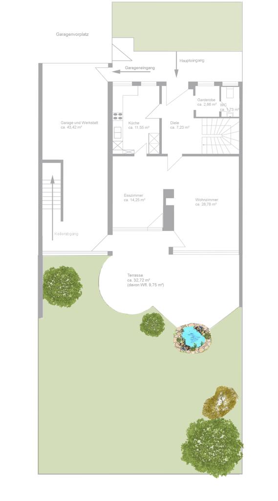 Über den kleinen Vorgarten treten Sie außerdem über den Haupteingang in eine geräumige Garderobe mit Gäste-WC ein und befinden sich in der großzügigen Diele des Hauses. Von hier kommen Sie in den Küchenbereich, welcher viel Platz für eine große Wohnküche bereitstellt. Von der Wohnküche, wie auch von der Diele aus, gelangen Sie in den Wohn-Essbereich, welcher durch eine Kaminwand räumlich voneinander getrennt ist. Wohn- wie auch Essbereich führen Sie hinaus auf eine liebevoll angelegte Südterrasse mit kleinem Teich und Brunnen. Von der Terrasse aus gelangen Sie auch in den helle Garage inklusive Wintergarten mit reichlich Fläche für eine Werkstatt oder Ähnliches, was eine echte Alternative zur herkömmlichen Garage bietet.