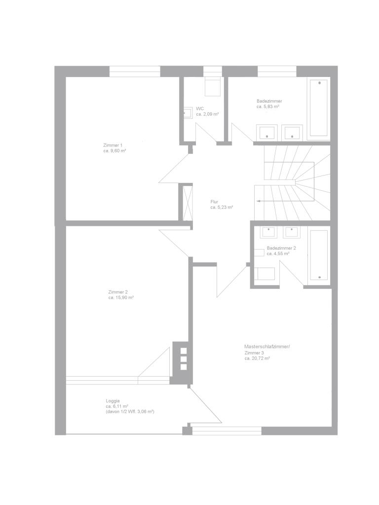 Im Obergeschoss befinden sich insgesamt 3 weitere Zimmer. Das Master-Schlafzimmer mit knapp 21 m² Fläche verfügt über ein eigenes Badezimmer sowie Zugang zur Südloggia. Die zwei weiteren Zimmer des Obergeschosses haben ebenfalls ein Badezimmer mit Badewanne und separatem WC. Zwei der insgesamt drei Zimmer verfügen über einen Zugang auf die Südloggia.