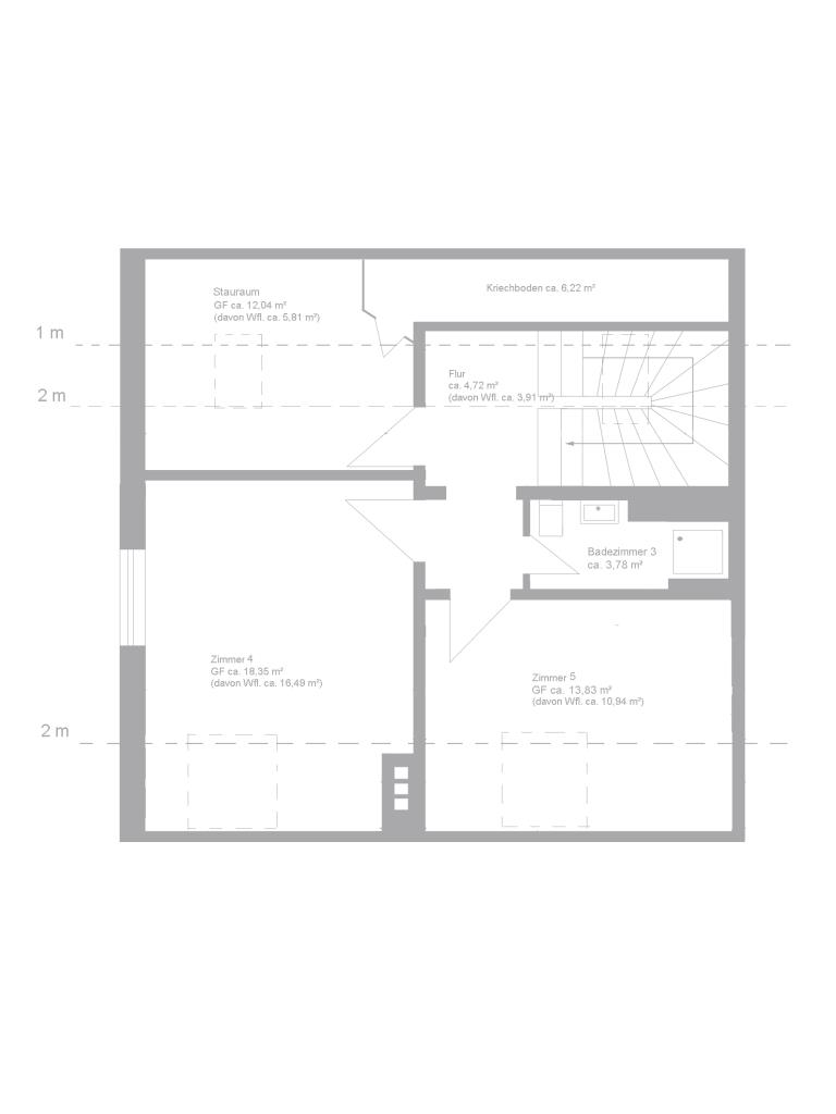 Das Dachgeschoss ist ausgebaut und umfasst zusätzlich eine Wohnfläche von ca. 41 m² bestehend aus 2 Zimmern, einem zusätzlichen Stauraum und einem dritten Badezimmer mit Dusche.