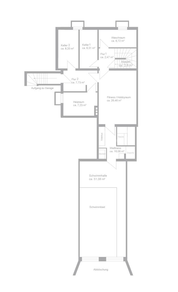 Das Untergeschoss verfügt über einen Hobby-/Fitnessraum. Im Anschluss befindet sich ein Wellnessbereich mit Sauna und Kaltbecken sowie eine ausgebaute Schwimmhalle mit großem Schwimmbad. Hier besteht jedoch sanierungsbedarf.