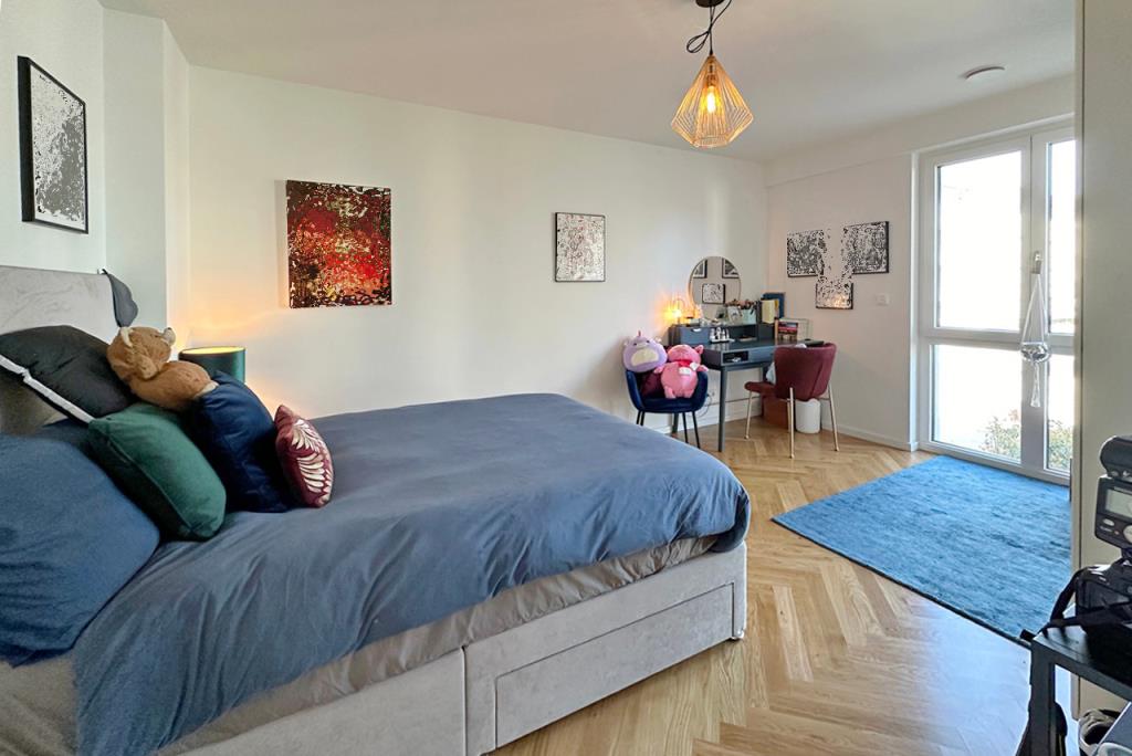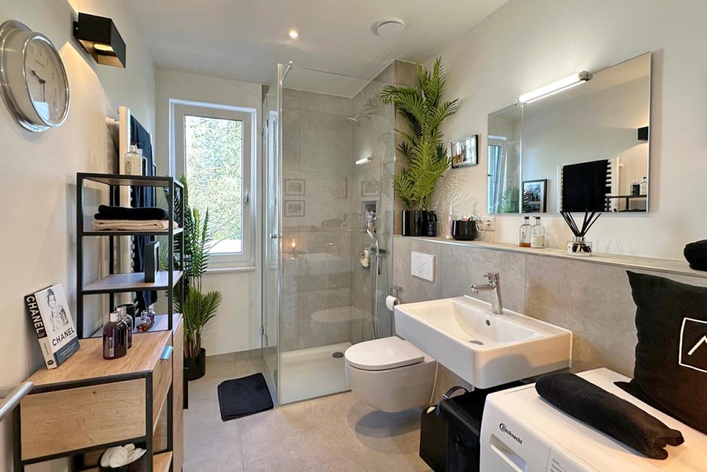 Das moderne Tageslichtbadezimmer wurde mit hellen, sanften Feinsteinzeug-Fliesen ausgestattet, verfügt über einen Handtuchwärmer, eine bodentiefe Rainshower-Dusche mit Echtglas-Abtrennung sowie einen Waschmaschinen- und Trockneranschluss.