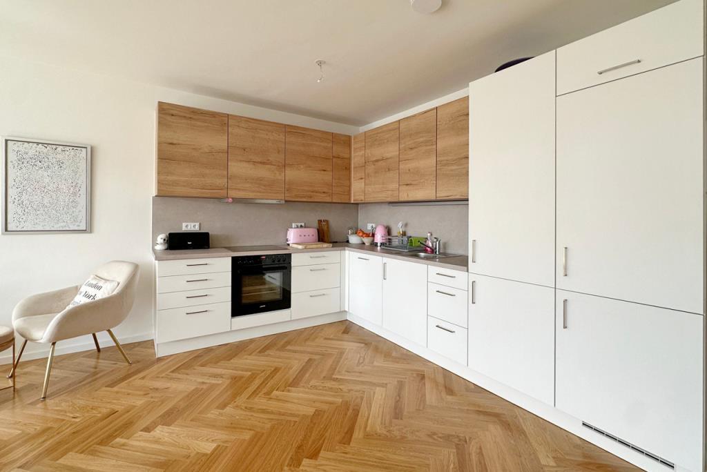 Es wurde eine Schreiner-Einbauküche eingebaut, welche komplett ausgestattet ist und mit viel Stauraum überzeugt.