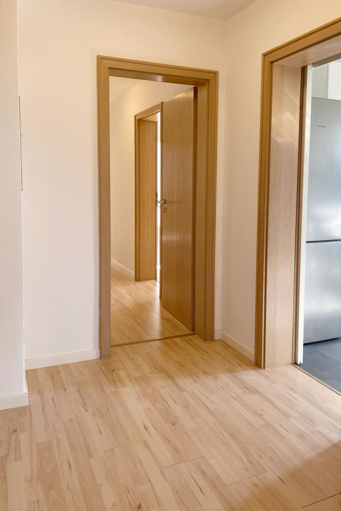 Zudem verfügt die Wohnung über zwei Badezimmer, einen geräumigen Eingangsbereich inkl. Abstellkammer, einen weiteren Flur und eine Einbauküche.