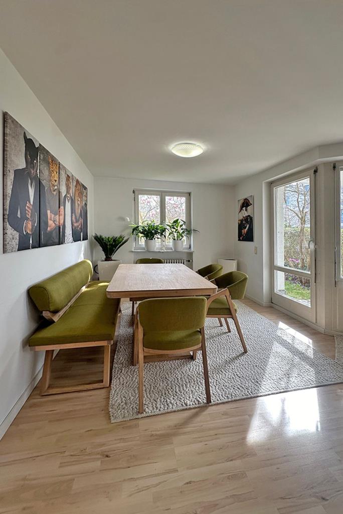 Der Wohn/-Esszimmer mit Zugang zu einer der beiden Terrassen (Süd-West-Terrasse) lädt zu sonnigen Abendstunden im Sommer ein. Die zweite Terrasse (Süd-Ost-Terrasse) ist über die beiden anderen Zimmer oder über den Garten begehbar und ist besonders charmant für ein gemeinsames Frühstück mit frühmorgendlichen Sonnenstrahlen und Vogelgezwitscher.