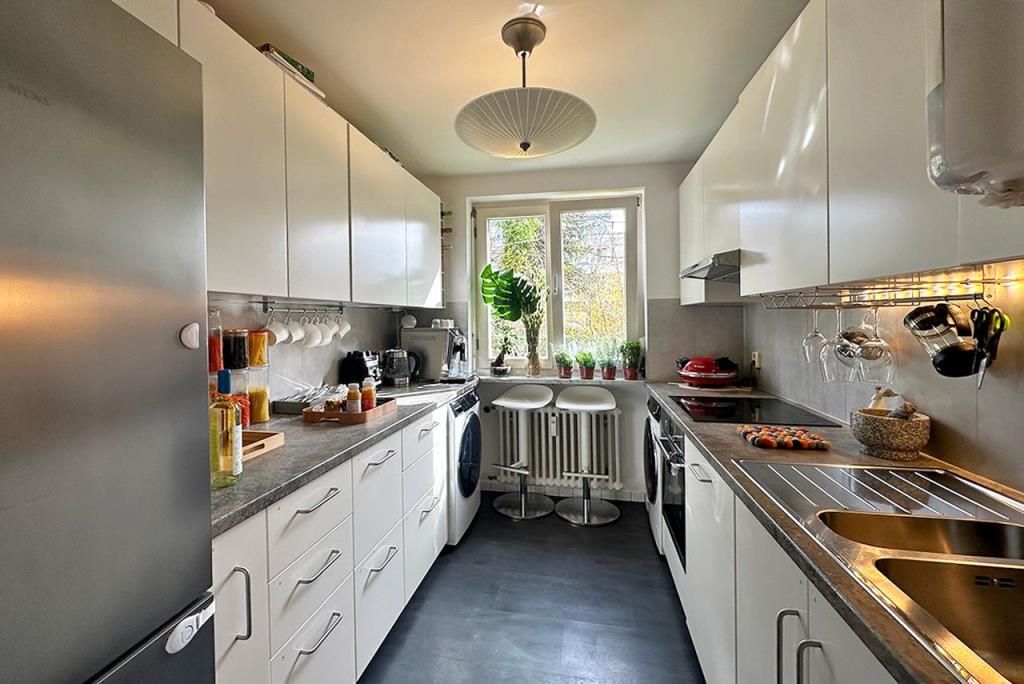 Die zweizeilige Einbauküche, mit jeglichen elektronischen Geräten, bietet allen Komfort. Eine Waschmaschine wie auch Trockner finden zudem Platz in der Küche.