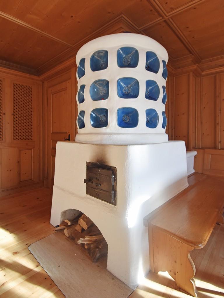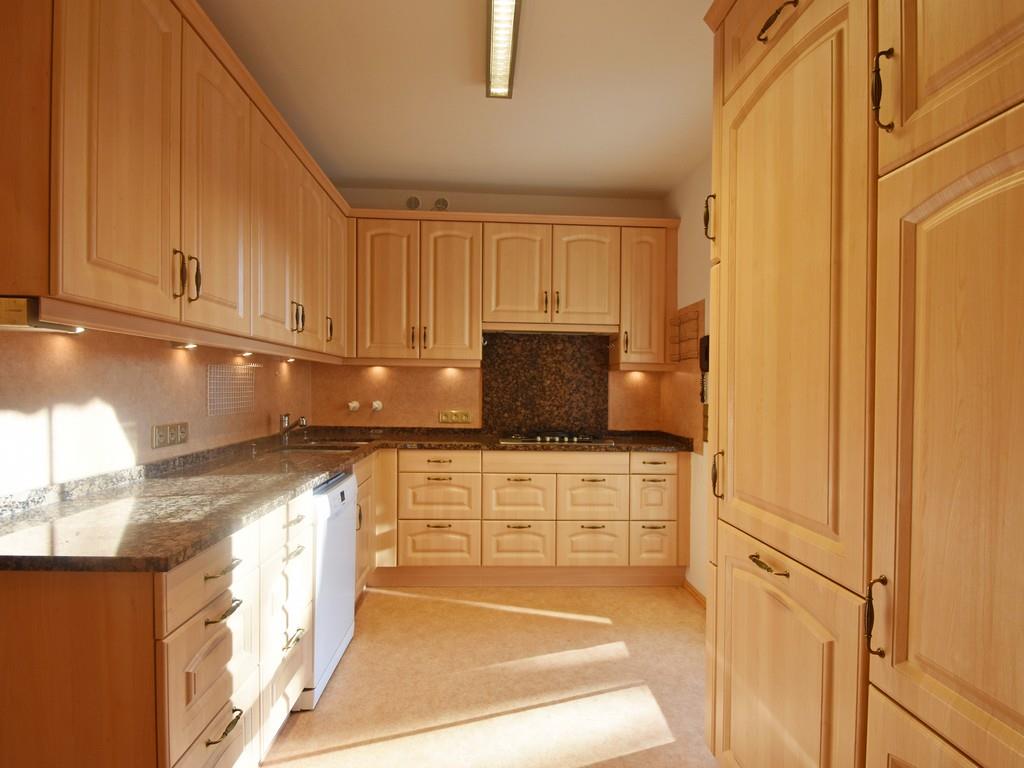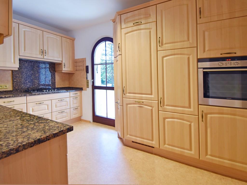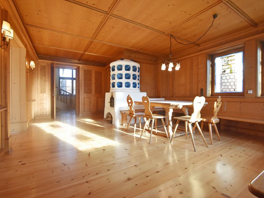 Die Küche mit Speisekammer befindet sich ebenfalls im Erdgeschoss und grenzt an den im Landhausstil gestalteten Essbereich mit Kachelofen an.