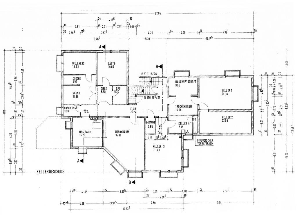 Das Untergeschoss umfasst eine Gesamtfläche von ca. 257 m² und verfügt über eine Sauna mit Wellnessbereich, einem hellen Gästezimmer mit anschließendem Badezimmer und einem großen Hobbyraum. Weiterhin befinden sich im Untergeschoss noch vier weitere Kellerräume, ein Trocken- und Hauswirtschaftsraum und ein Heizraum.