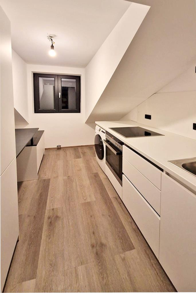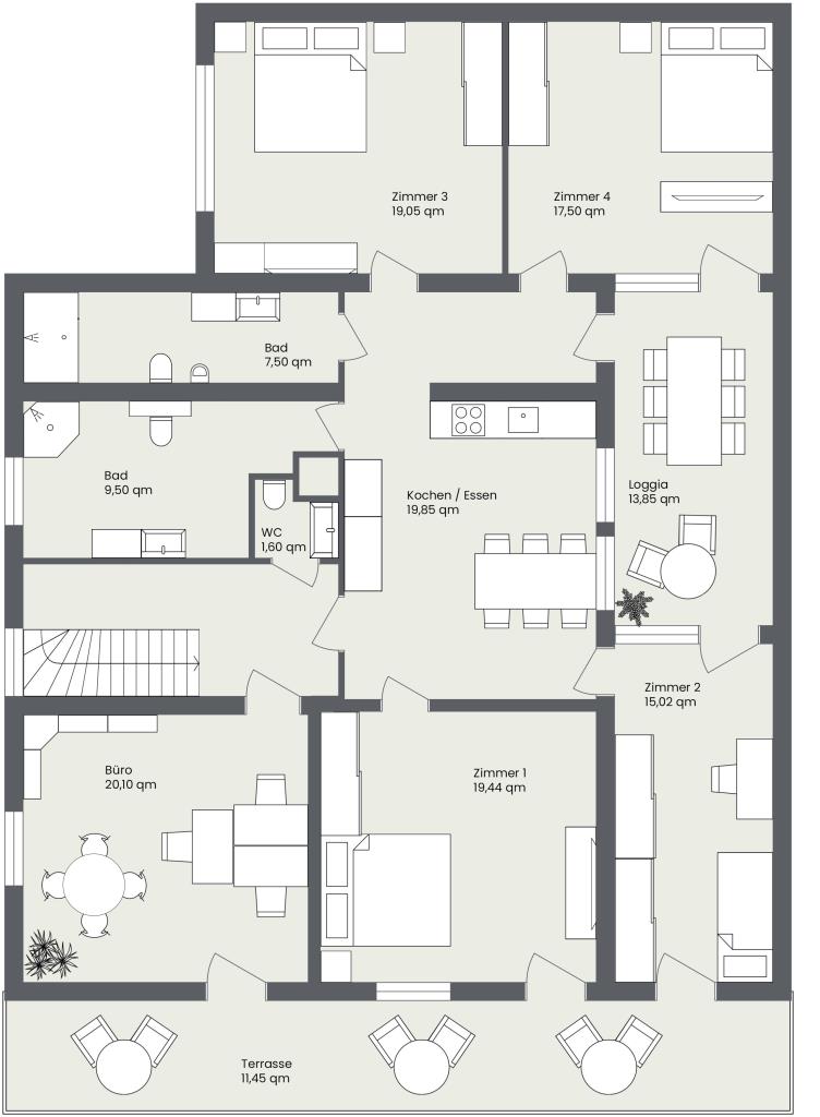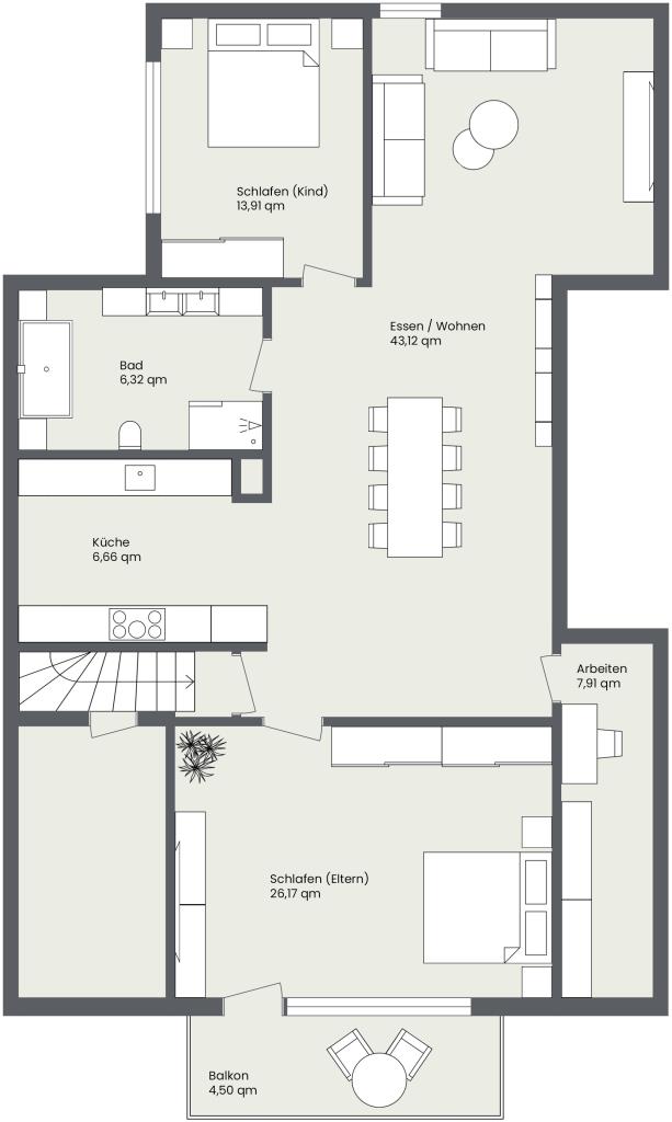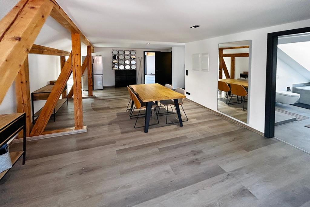 Das Dachgeschoss wurde vollständig zu einem komfortablen Wohnbereich ausgebaut. Die stilvolle Gestaltung und der hochwertige Ausbau mit modernem Badezimmer und vollausgestatteter Küche schaffen eine angenehme Wohnatmosphäre. Weiterhin lädt das große und helle Schlafzimmer mit Balkon und der große Wohn- und Essbereich zum Entspannen und Wohlfühlen ein. Zudem bietet die Wohnung ebenfalls ein Gäste-/Arbeitszimmer und eine Abstellnische.