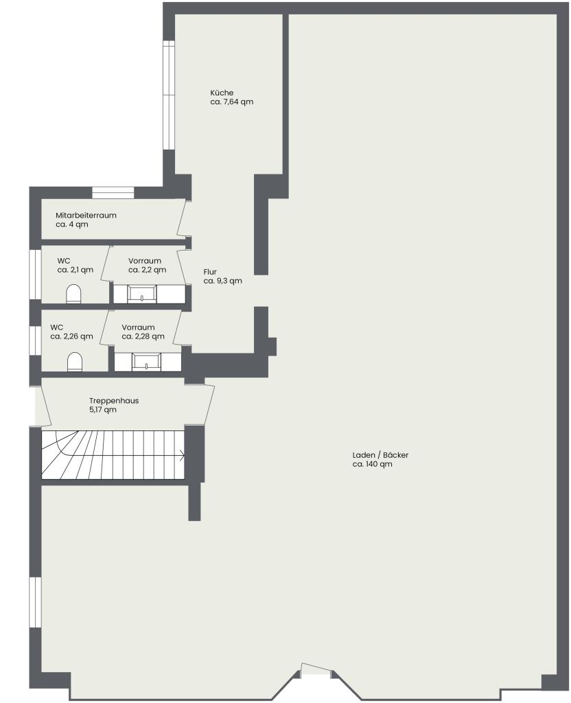 Im diesem Bereich befindet sich eine geräumige Ladeneinheit, welche seit 2009 an eine bekannte und gut frequentierte Bäckerei vermietet ist. Große Schaufensterfronten sorgen für viel Tageslicht und ermöglichen eine attraktive Präsentation des Geschäfts.