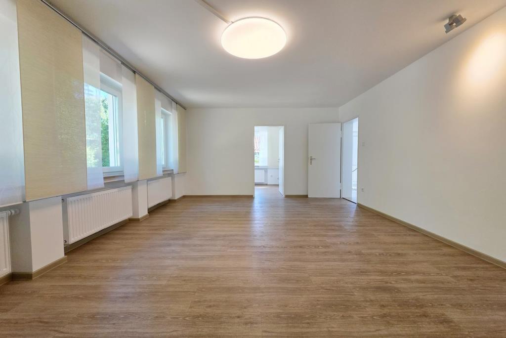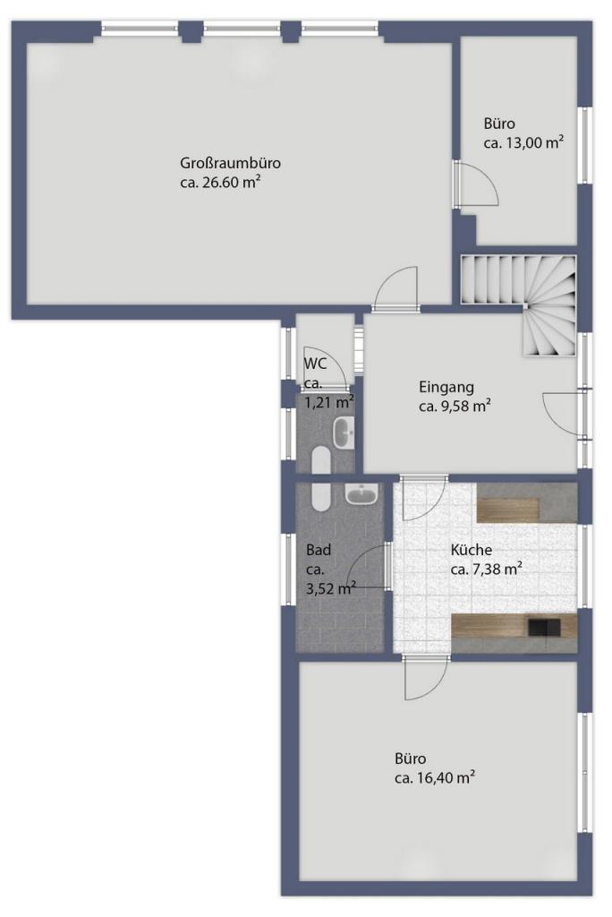 Im Erdgeschoss befinden sich drei gut geschnittene Büroräume, die sich ideal für Einzel- oder Teamarbeitsplätze anbieten. Zudem verfügt die Etage über eine funktionale Küche, ein modernes Duschbad sowie ein Gäste-WC. Die großzügigen Fenster sorgen für eine helle und freundliche Arbeitsatmosphäre.