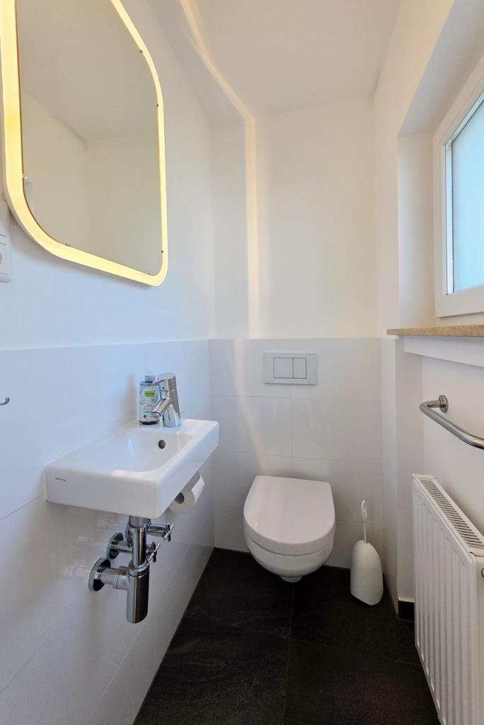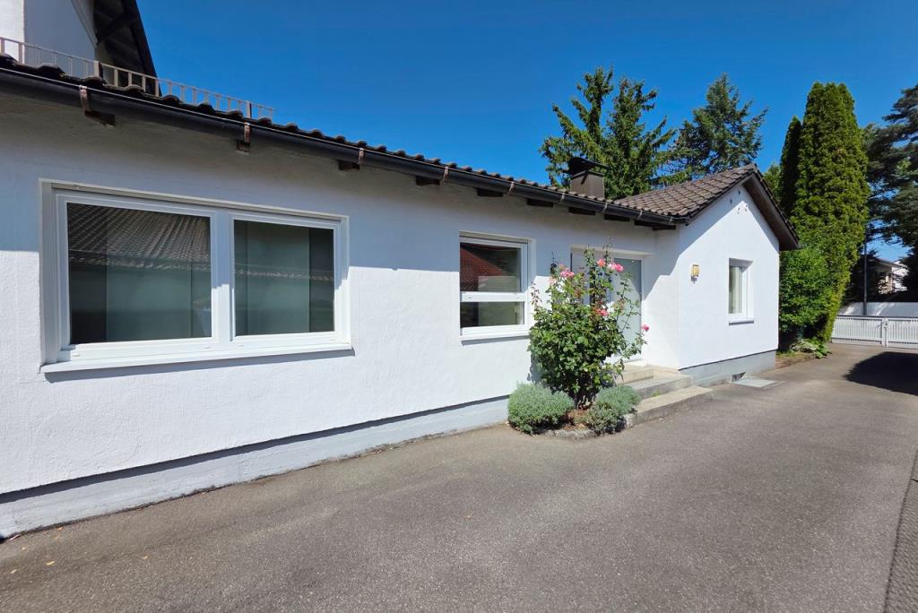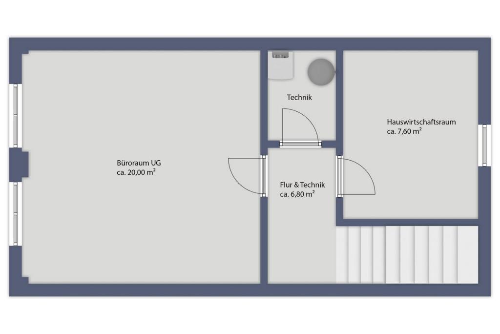 Eine runde Treppe im Eingangsbereich führt ins Souterrain, wo sich ein großer, lichtdurchfluteter Büroraum befindet. Der Raum eignet sich perfekt für Besprechungen, Konferenzen oder als zusätzlicher Arbeitsbereich. Ergänzt wird das Souterrain durch einen praktischen Abstellraum sowie einen Technikraum, der ausreichend Platz für die Unterbringung von Geräten und Technik bietet.