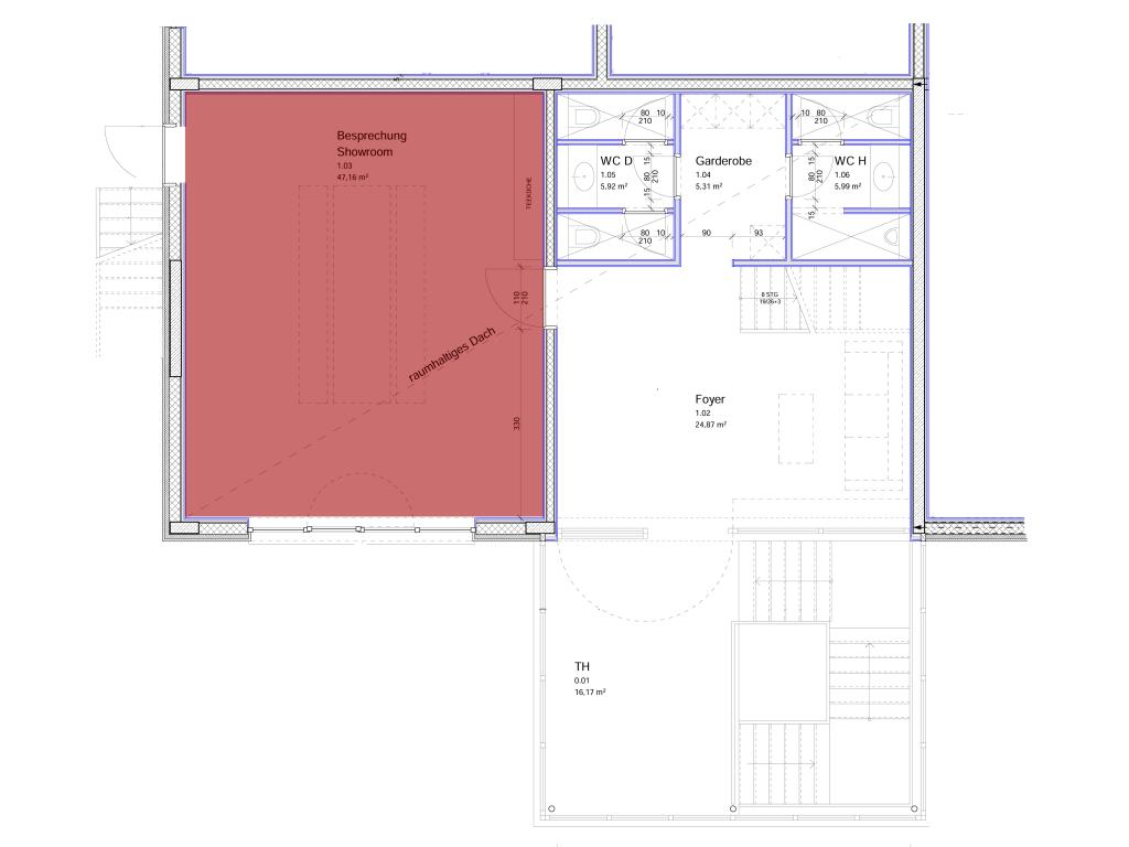 Weiterhin besteht die Möglichkeit, im Foyer Besprechungstermine abzuhalten. Dazu wird vom Vermieter ein Besprechungstisch zur Verfügung gestellt. Zur Einheit gehört noch eine gemeinschaftliche Garderobe und zwei getrennte Toilettenräume (Damen und Herren WC).