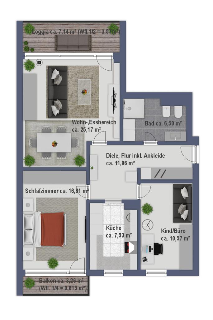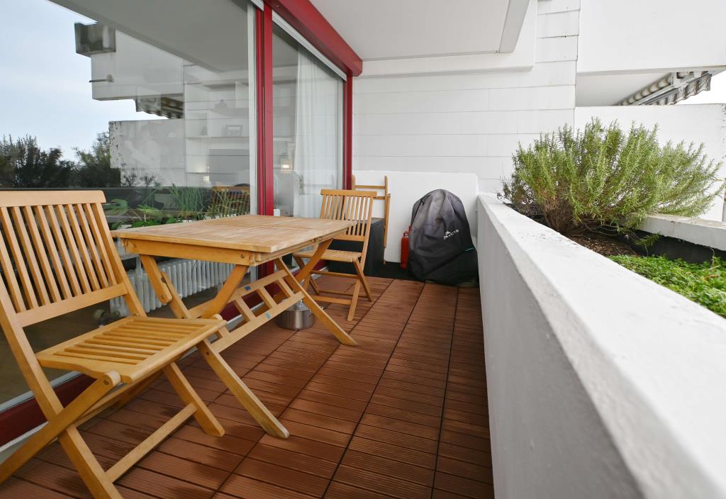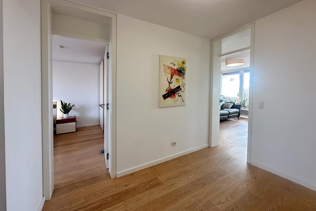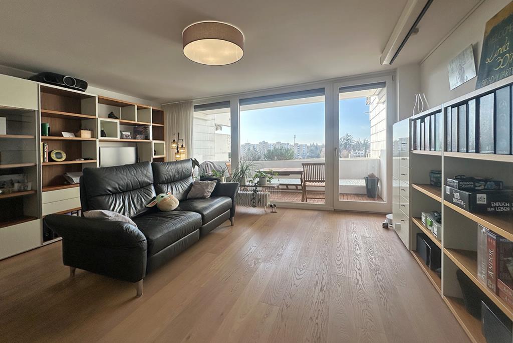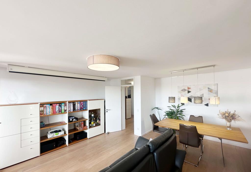 Die Wohnung besteht aus einem geräumigen Eingangsbereich samt Einbau Ankleide, einem großzügigen Wohn-/Essbereich, einer separaten Küche (hochwertige Einbauküche inkl. elektrischer Geräte vorhanden), einem Badezimmer mit Waschmaschinenanschluss, sowie zwei Zimmern. Des Weiteren erstreckt sich eine große Loggia (auch bei kühleren Tagen oder Regen zu benutzen) über die Westfront und ist vom Wohnzimmer aus zugänglich sowie ein Ostbalkon, welcher vom Schlafzimmer aus begehbar ist.