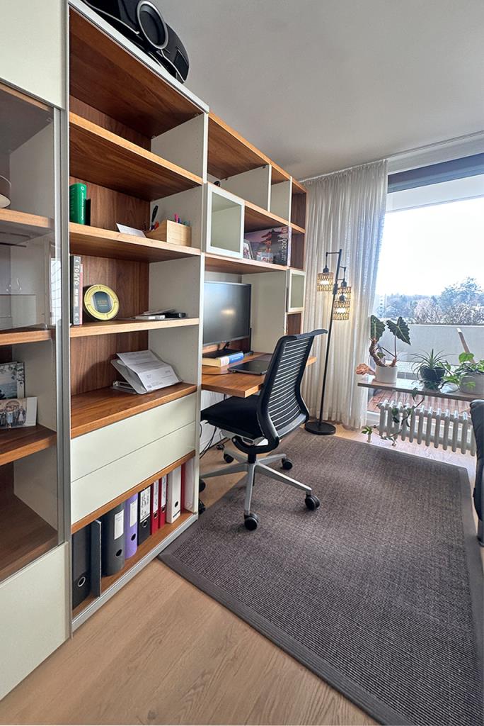 Die Wohnung wird komplett möbliert vermietet. u.a. mit 4K Beamer (EH-TW9400) + Leinwand (Spalluto WS S GrandCinema 16:9 – 244 cm), maßangefertigten Einbauschränken, intelligentes Lichtsystem, Markenmöbeln und einer hochwertigen Einbauküche von Leicht mit Markenküchengeräten (Miele, Siemens). Das Büro/Kinderzimmer kann nach individuellem Belieben gestaltet werden und ist leer.
