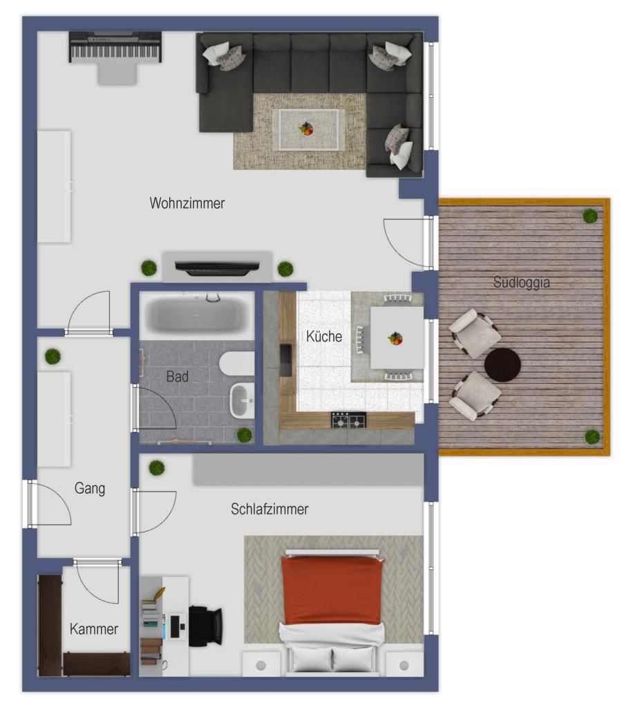 Der großzügige Wohn-Ess-Bereich mit direktem Zugang zur Südloggia bildet das Herzstück der Wohnung und lädt zum Entspannen und Wohlfühlen ein. Darüber hinaus bietet die Wohnung einen Eingangsbereich mit einer praktischen kleinen Abstellkammer, ein Badezimmer mit Badewanne und ein geräumiges Schlafzimmer.