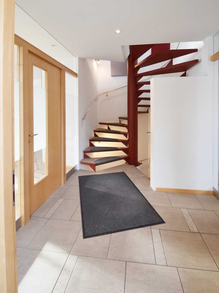 Die Wohneinheit erstreckt sich über eine gesamte Wohnfläche von ca. 164 m² sowie eine Nutzfläche von ca. 39 m². Über den Windfang mit angrenzendem Eingangsbereich mit Wendeltreppe gelangen Sie in den zu einem großen und hellen Wohnzimmer ausbaubaren Bereich mit bereits vorhandener offen gehaltener Essküche sowie in das derzeit als Büro genutzte Zimmer.